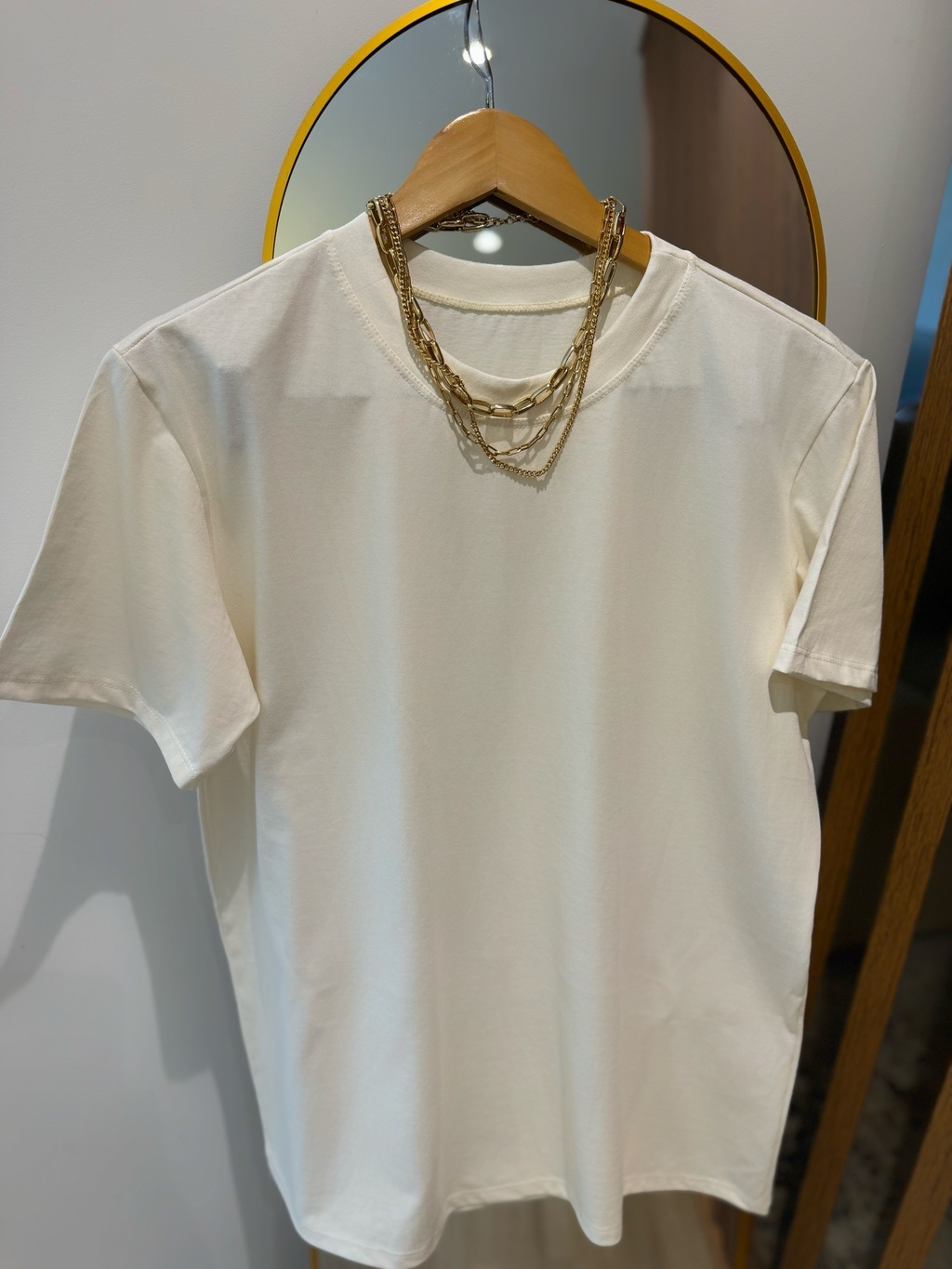 Para um look casual e confortável, combine a T-shirt Basic com um short jeans e tênis. Se preferir algo mais elegante, aposte em uma saia midi e acessórios delicados.